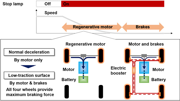 松開加速踏板會觸發電動機啟動車輛減速過程。當車輛完全停止時,會自動應用剎車。另外,在低附著力路面行駛時,剎車也會同步啟動,利用四個車輪安全地使車輛減速。