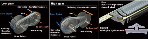 CVT實際上就是通過與兩個滑輪連接的鋼帶連續不間斷地促使變速比發生變化的汽車變速器。CVT的基本構造是由傳達發動機扭力的滑輪(行駛滑輪)、將扭力向鋼帶輸送的滑輪及連接兩個滑輪的鋼帶組成。通過改變各個滑輪的凹入幅度,可隨意設定變速比。由此,CVT通過連接不間斷改變變速比,將不會產生變速產生的震動,實現平穩行駛,真可謂是性能優越的變速器。