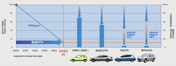 根據聯合國政府間氣候變化專門委員會(IPCC)第四卷評估報告顯示,地球大氣中的二氧化碳濃度應該控制在450ppm以下,才能使平均溫度增長幅度控制在2攝氏度之內。在此前提下,日產汽車公司計算得知新車的二氧化碳排放量在2050年時需減少90%(對比2000年)。為此目標,日產汽車公司致力于不斷改良車輛的動力系統并積極推進能量轉換效率,力求減少二氧化碳排放量。