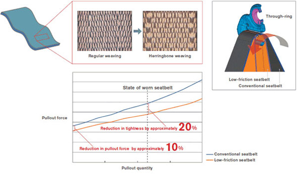 將座椅安全帶帶子的織法由正則織改為變化杉綾織(將邊緣部位及中央部位的織針進(jìn)行優(yōu)化分配的織法),以此使得安全帶帶子易于彎曲,減輕與穿孔部位的褶子阻力。