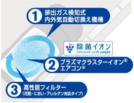 讓空調吹出的風之中帶有高濃度離子,在抑制浮游菌等、減少附在內飾上的臭氣同時,保持肌膚的濕潤。(※2)內外氣體自動切換裝置不僅具有廢氣探測功能,還可探測車外家畜及工廠的臭氣,將受污染帶有臭味的空氣阻擋在車外。