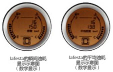 為協助駕駛者提高油耗意識做到恰當駕駛,行駛過程中汽車的瞬間油耗及平均油耗會顯示在儀表內的顯示器上。預計通過實時確認不同駕駛方法的每一瞬間變化,可達到降低約10%耗油量的效果(公司內部測定值※)。
