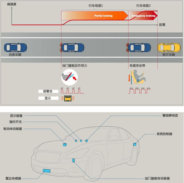 當系統判斷駕駛者需要進行減速操作時,則通過顯示和警報音提醒其注意,在促使駕駛者進行減速操作的同時,反彈油門踏板并進行平緩制動。協助駕駛者進行減速操作,盡量避免緊急制動的情況出現。