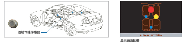 ■利用配置在座位周圍的酒精氣味傳感器探測酒精氣味。當(dāng)探測到酒精氣味時(shí),就會(huì)通過聲音及車載導(dǎo)航儀畫面的顯示向駕駛者發(fā)出警報(bào)。
