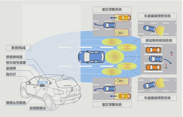 帶有后視攝像頭的多元感應系統,采用了日產汽車引以為豪的全景式影像監控系統的圖像解析技術。一個攝像頭可以將車體側面、后面的各種風險盡收眼底。比如,如果感知到相鄰車道的車從后方駛來,"盲區預警系統"則提示注意;如果行駛過程中偏離車道,"車道偏離預警系統"則發出警報;如果車體后方有正在移動的人或物體,則"移動物體探測系統"自動啟動。警示信號或聲音會隨時提醒駕駛者注意已經出現的風險,因此駕駛者可以放心地專心駕駛。帶有后視攝像頭的多元感應系統,以簡單的系統構成實現了多重功能,旨在為更多的駕駛者提供無憂駕駛體驗。為實現"零事故"的汽車社會,日產汽車一直不懈努力。