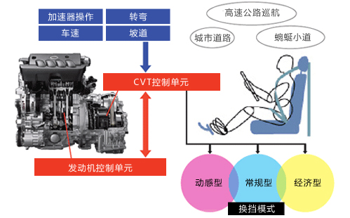 該系統(tǒng)將行駛狀況和行駛動(dòng)態(tài)傳輸至CVT控制單元,以便選擇最適合當(dāng)前行駛情況的變速模式。